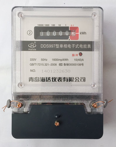 DDS997型单相电子式电能表,广泛用于计量居民住宅、机关、商店等照明,家电等的用电量。该表采用低功耗集成电路技术和SMT制造工艺,用以计量额定电压220V、额定频率50Hz的交流单相有功电能。